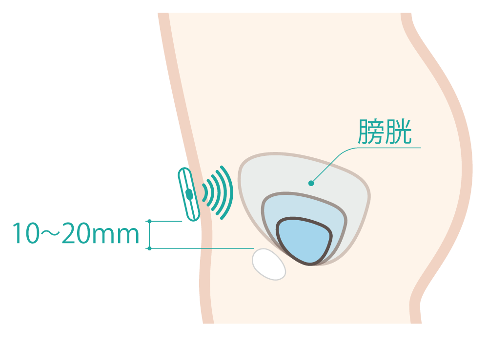 DFreeの仕組み: 下腹部に装着した本体の超音波で膀胱の変化を捉え、携帯端末にお知らせする